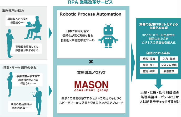 メイソンは、バックオフィス部門の生産性向上と人的資源の有効活用を推進するため、RPA(Robotic Process Automation)ツールを活用し業務自動化を推進する業務改革サービスを提供いたします。